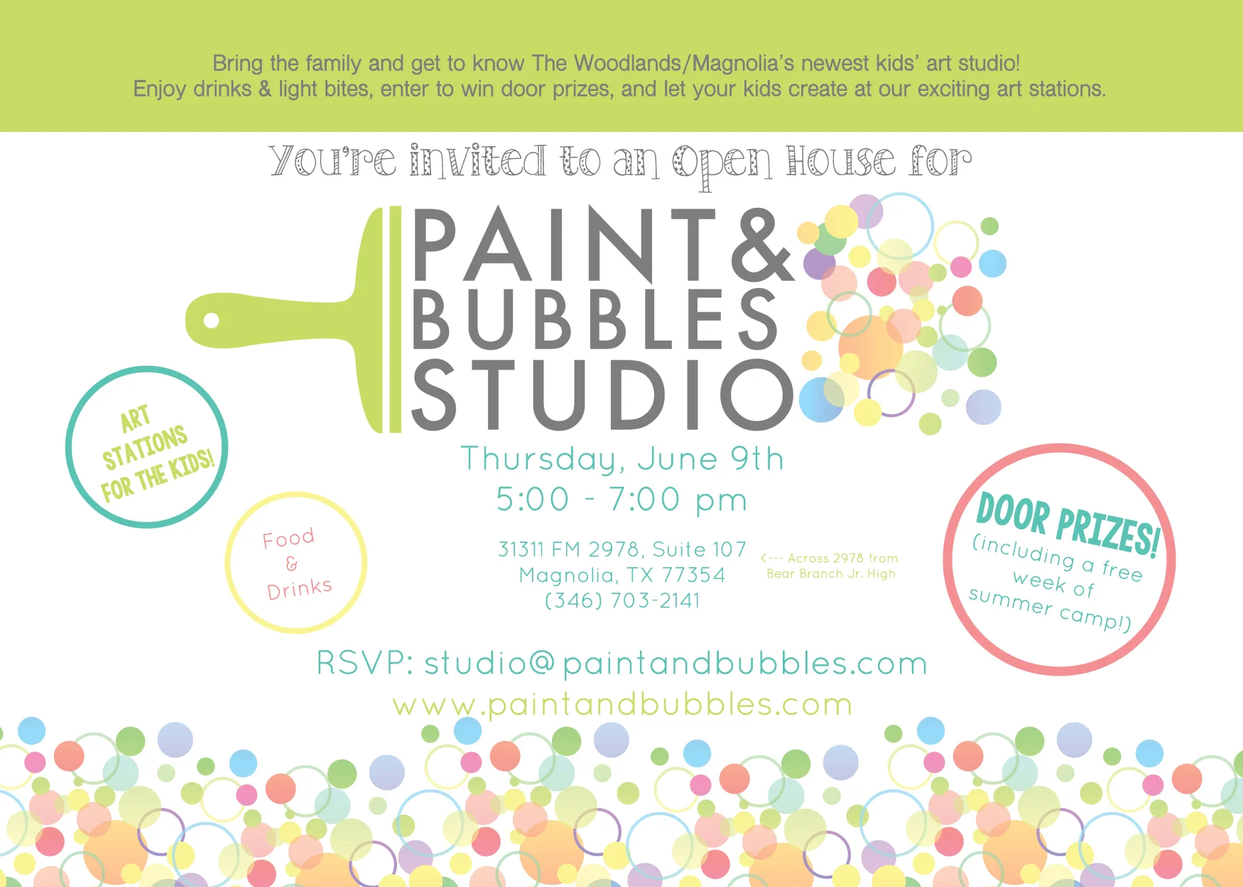 Enjoy drinks & light bites, enter to win door prizes, and let your kids create at our exciting art stations. Please RSVP: studio@paintandbubbbles.com